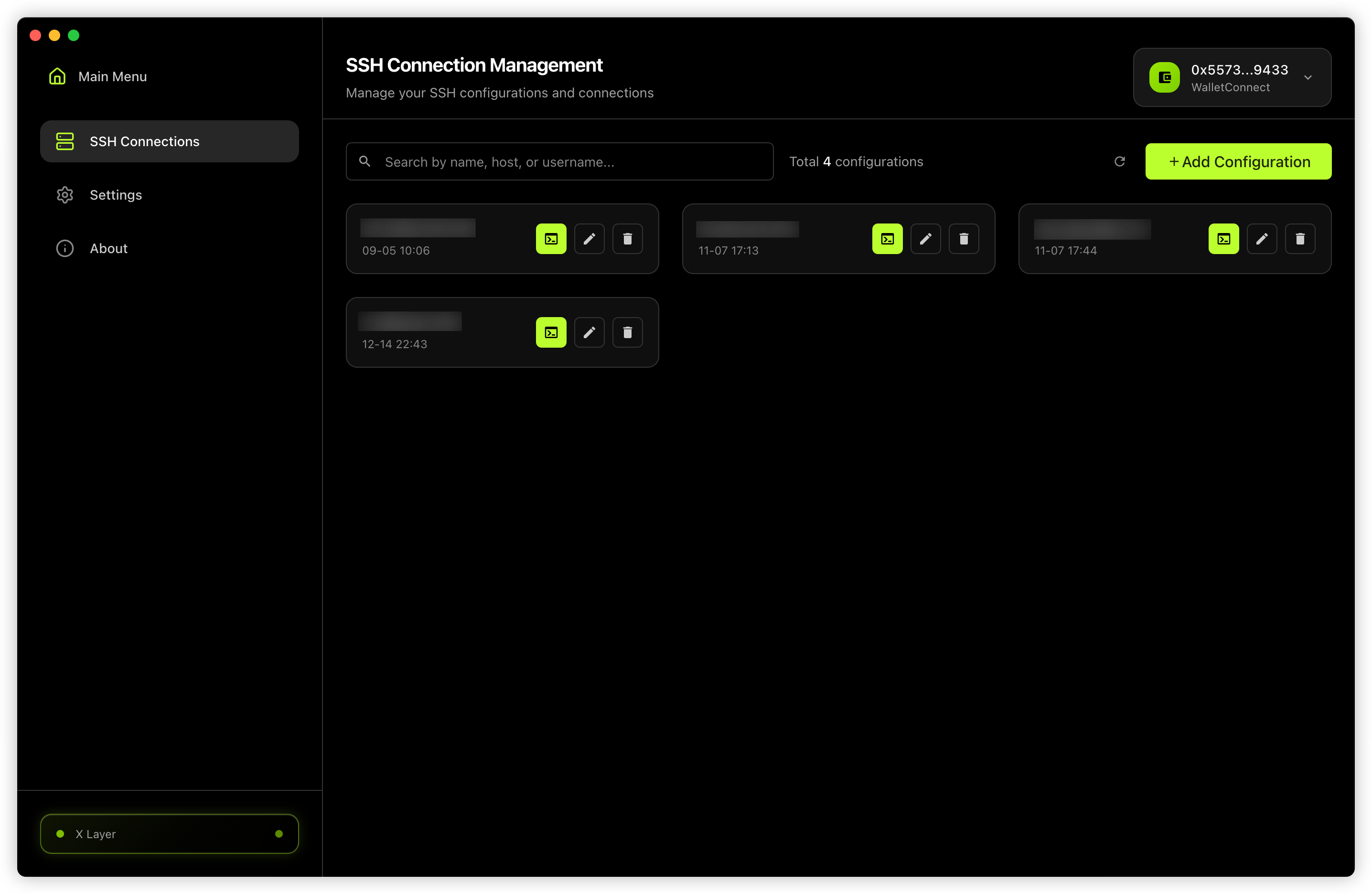 这里没有中心化服务器,所有的 ssh 配置通过钱包签名加密上链,只有钱包持有者能够解密,跨设备同步